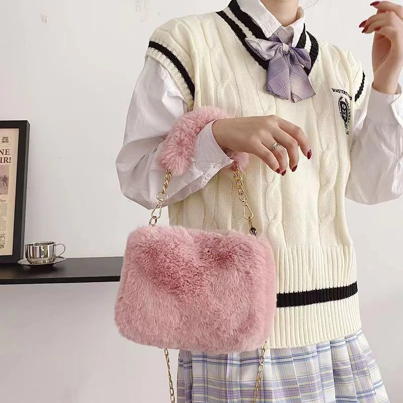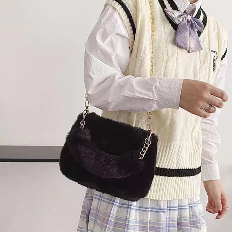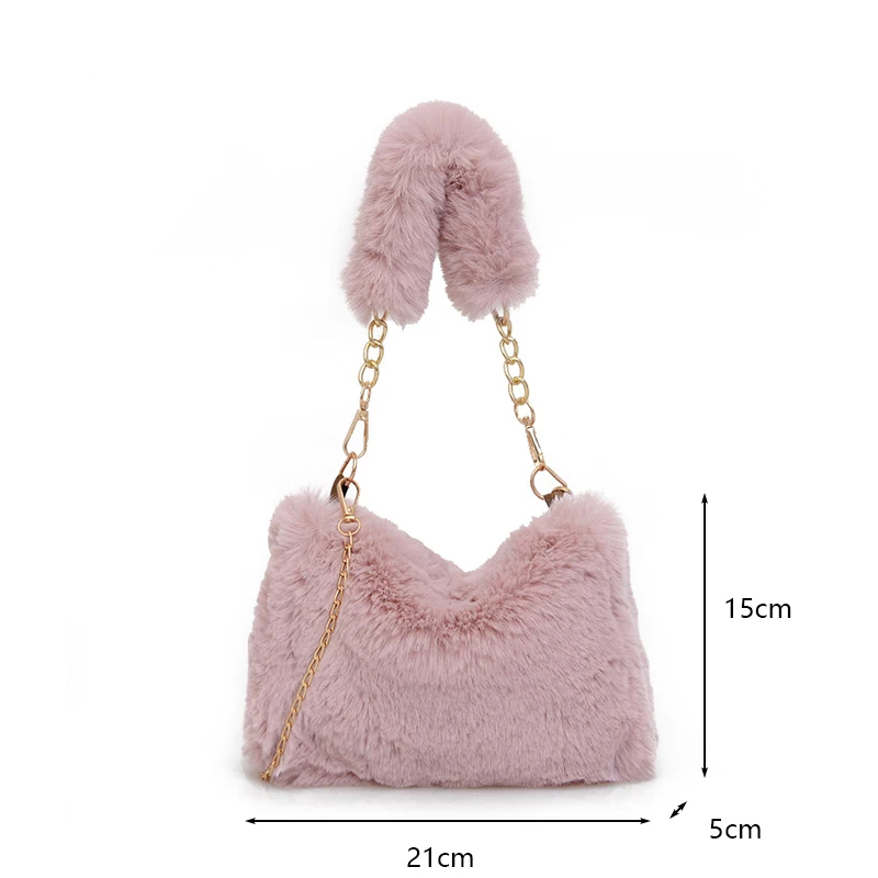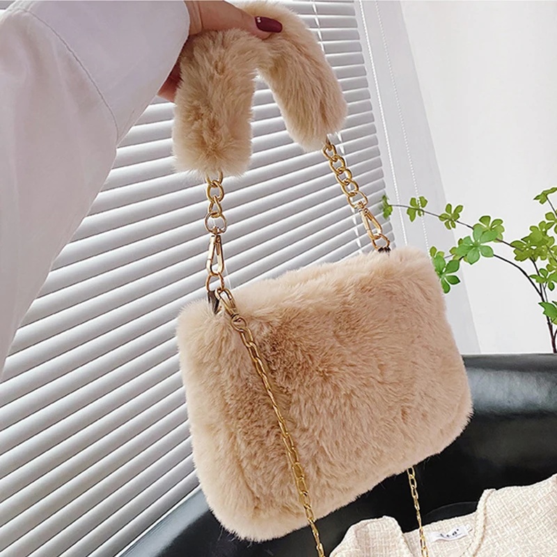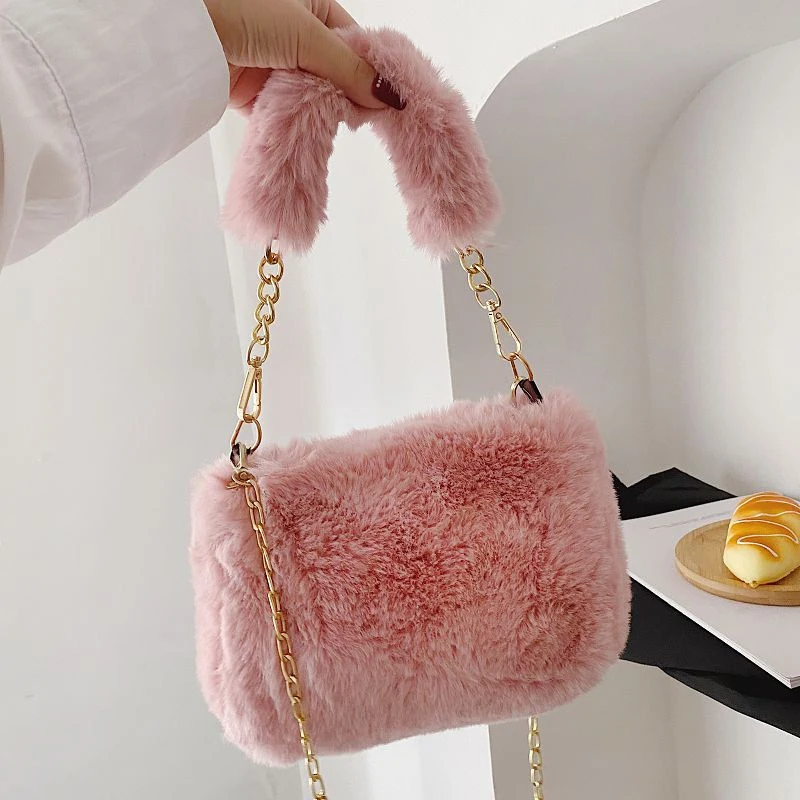 • Autumn and Winter Plush Handbag Small Chain Crossbody Bag Fashion Square Faux Fur Shoulder Bag Fluffy Warm Shopper Totes