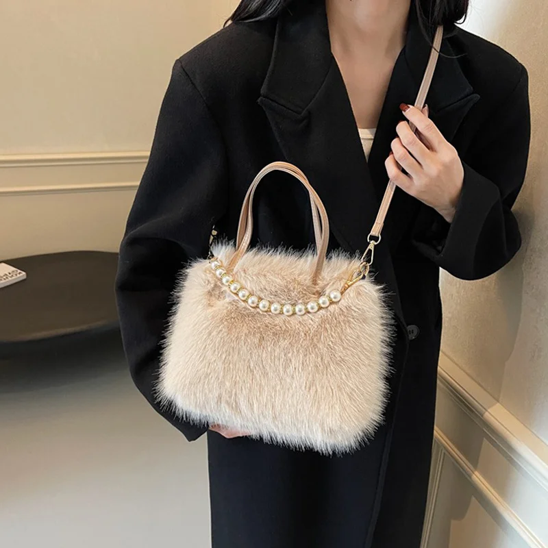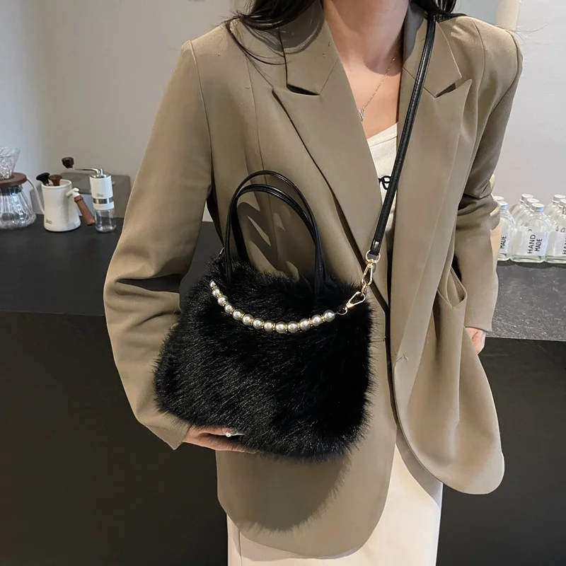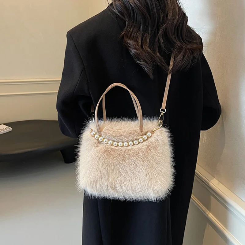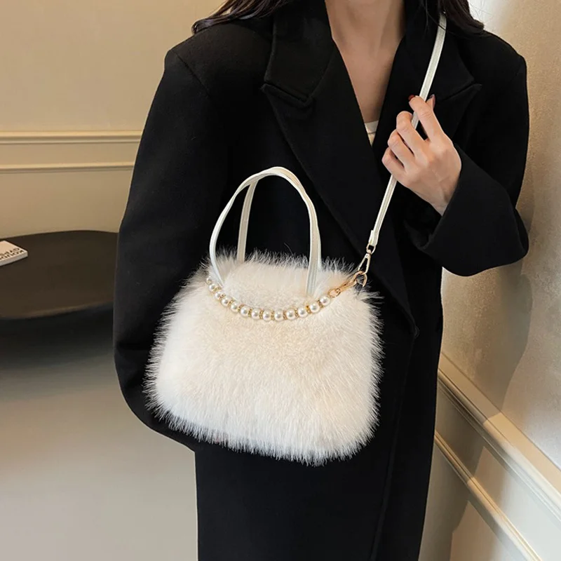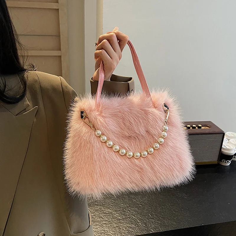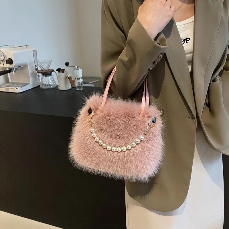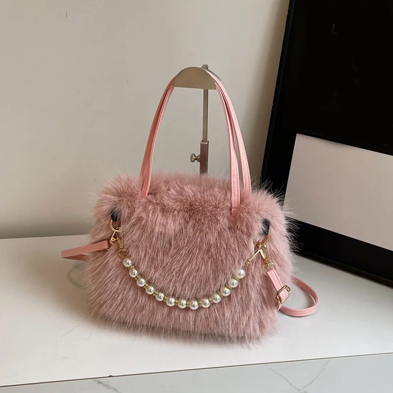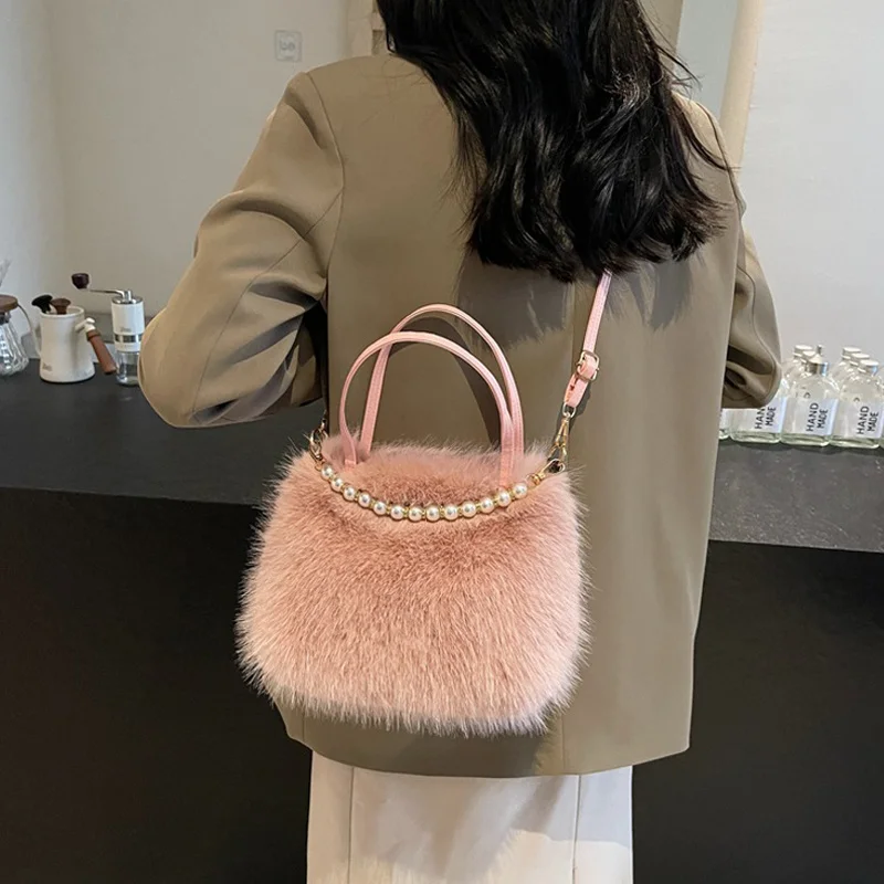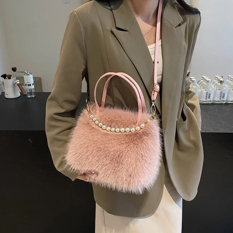 • Candy Color Pearl Handle Women's Plush Crossbody Bag Portable Female Furry Handbags Winter Fashion Casual Shoulder Bags