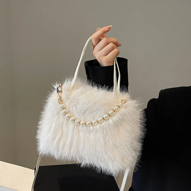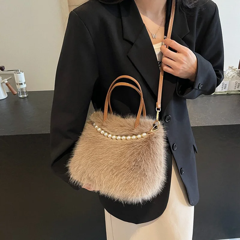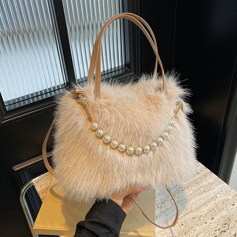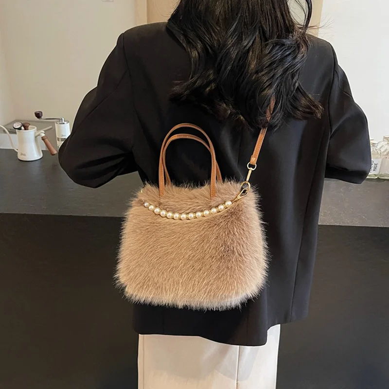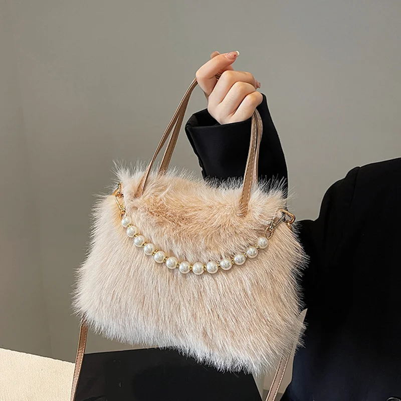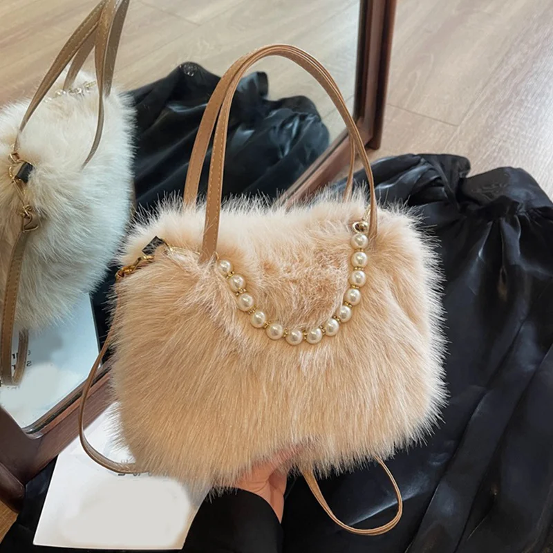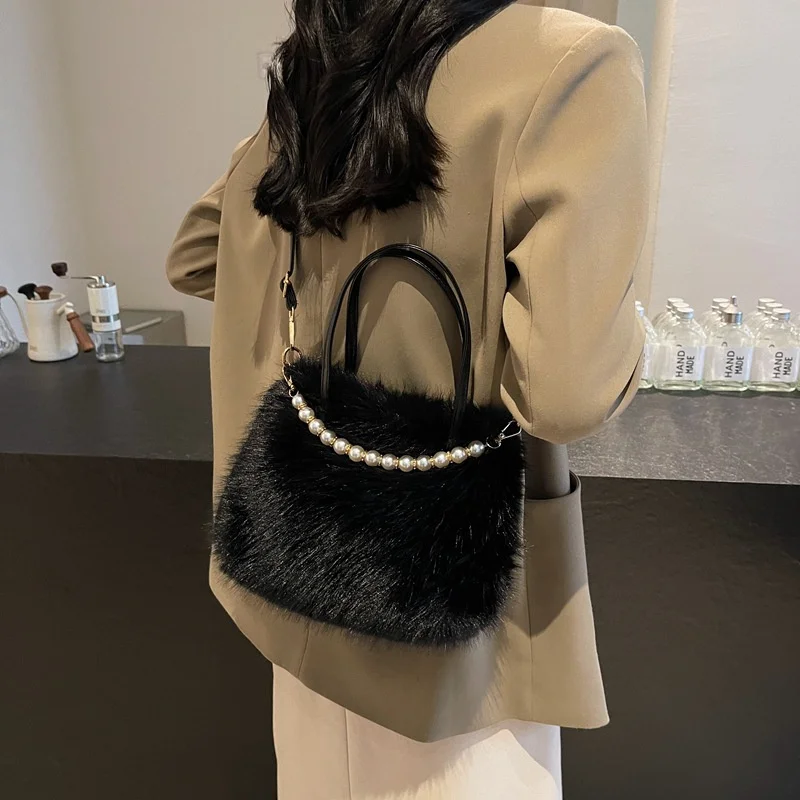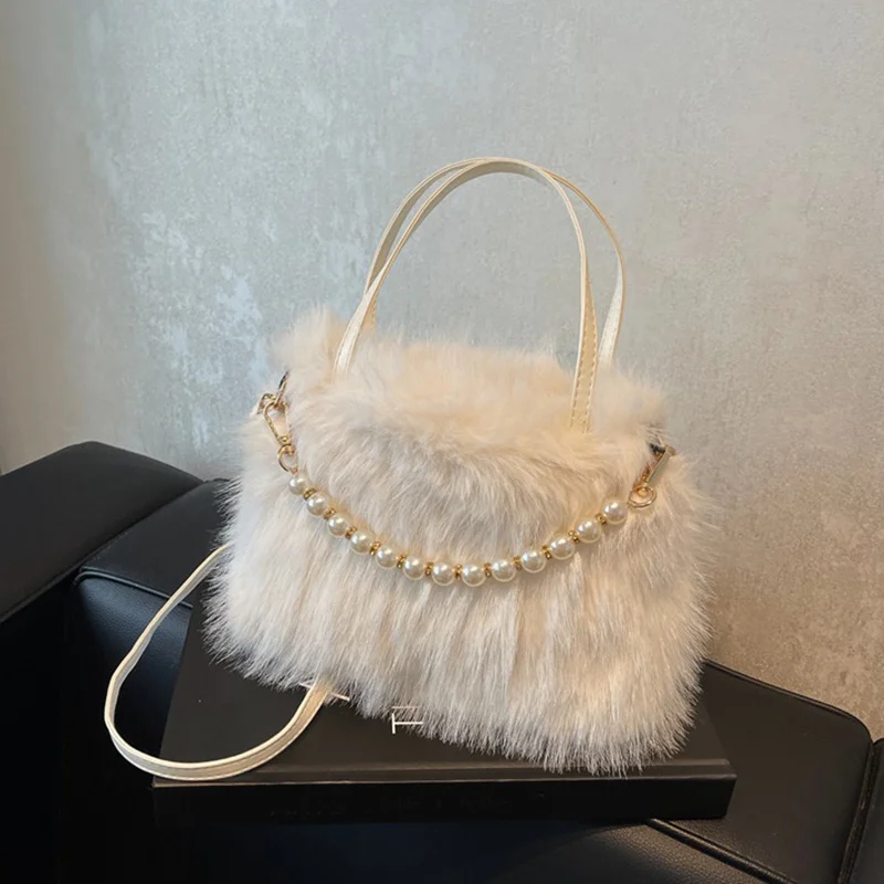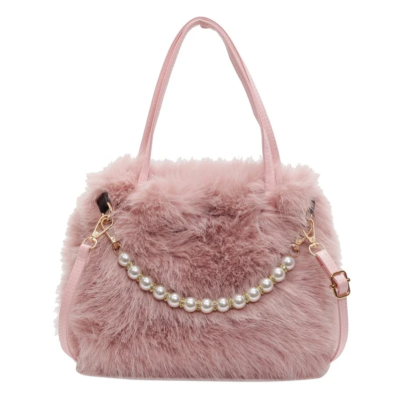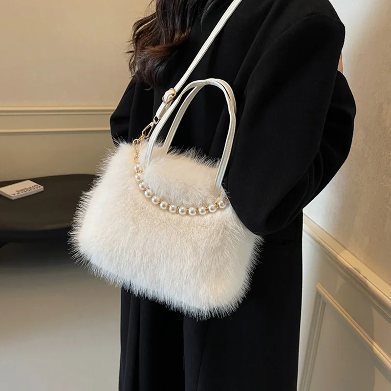 • Candy Color Pearl Handle Women's Plush Crossbody Bag Portable Female Furry Handbags Winter Fashion Casual Shoulder Bags
