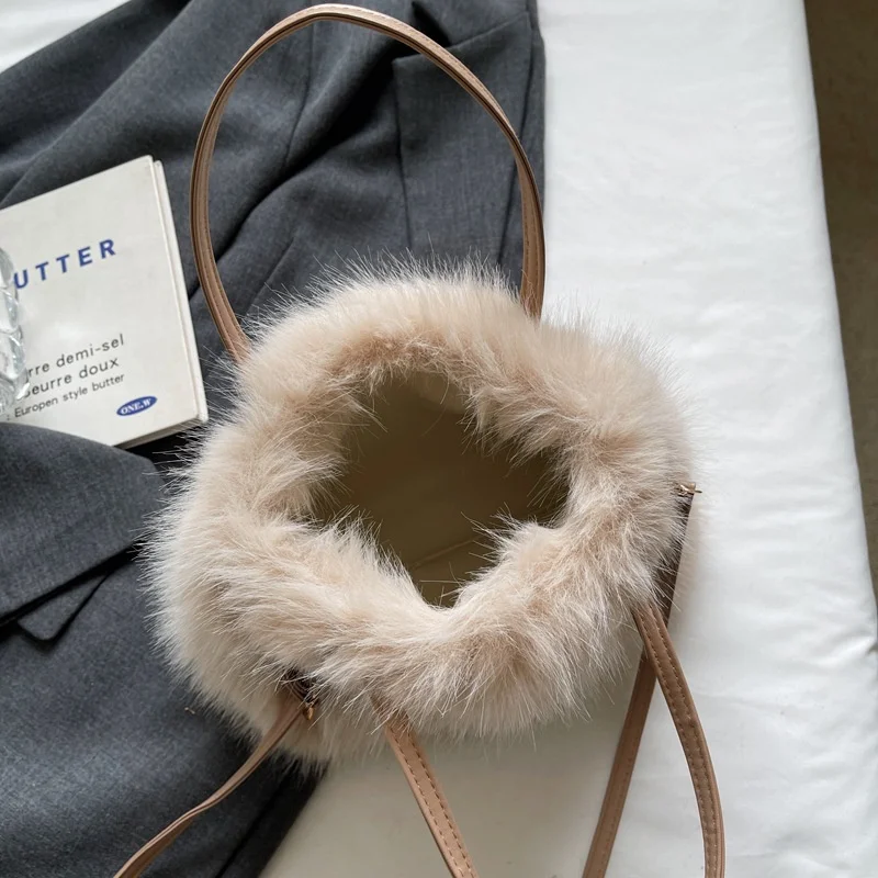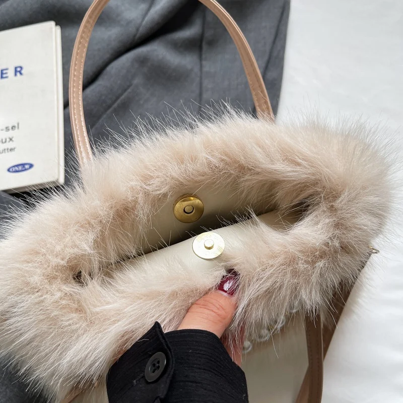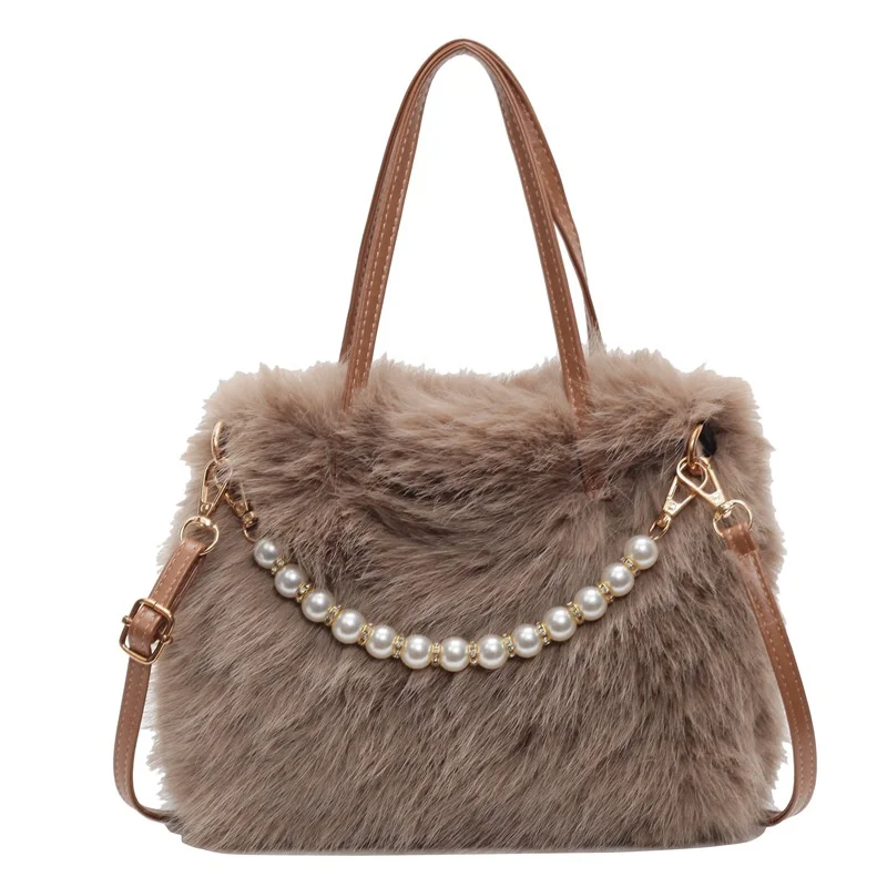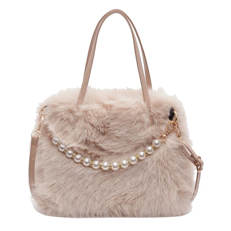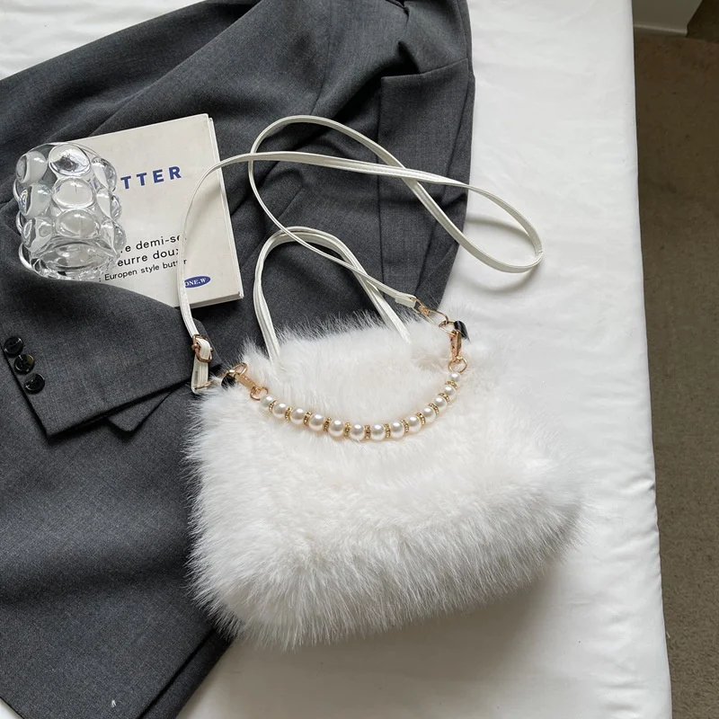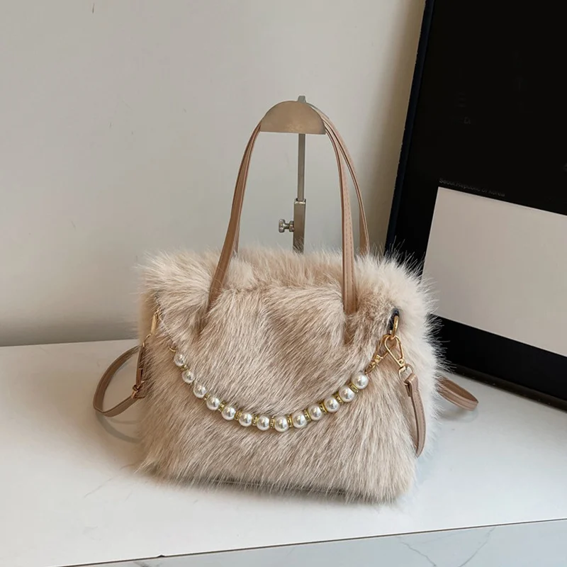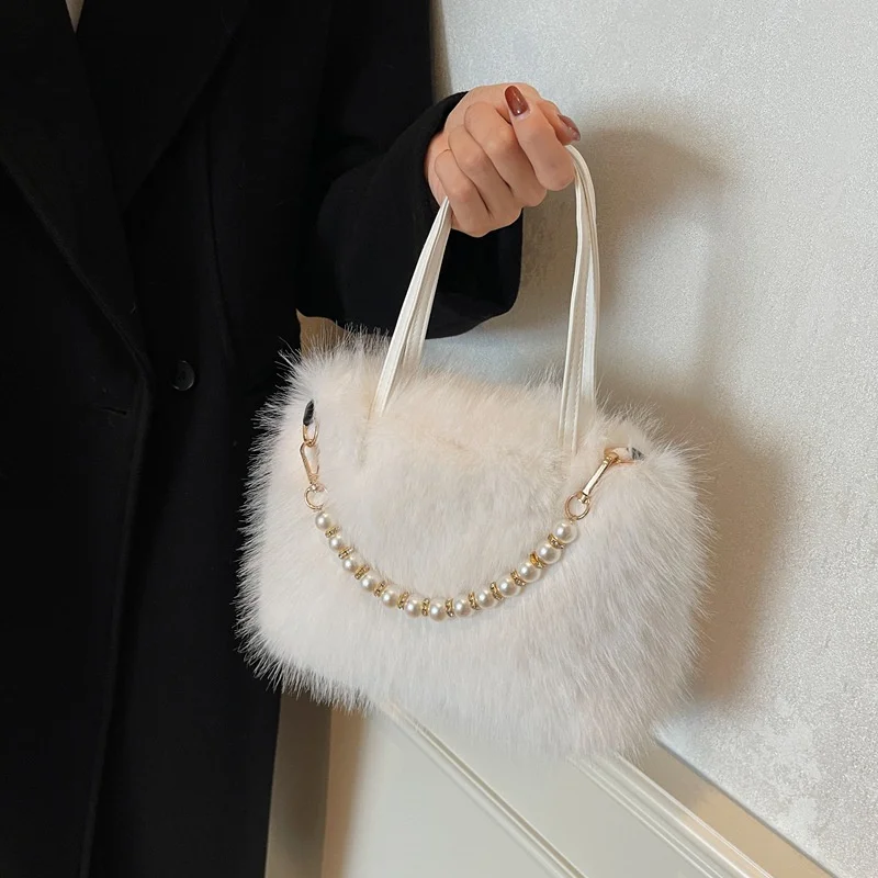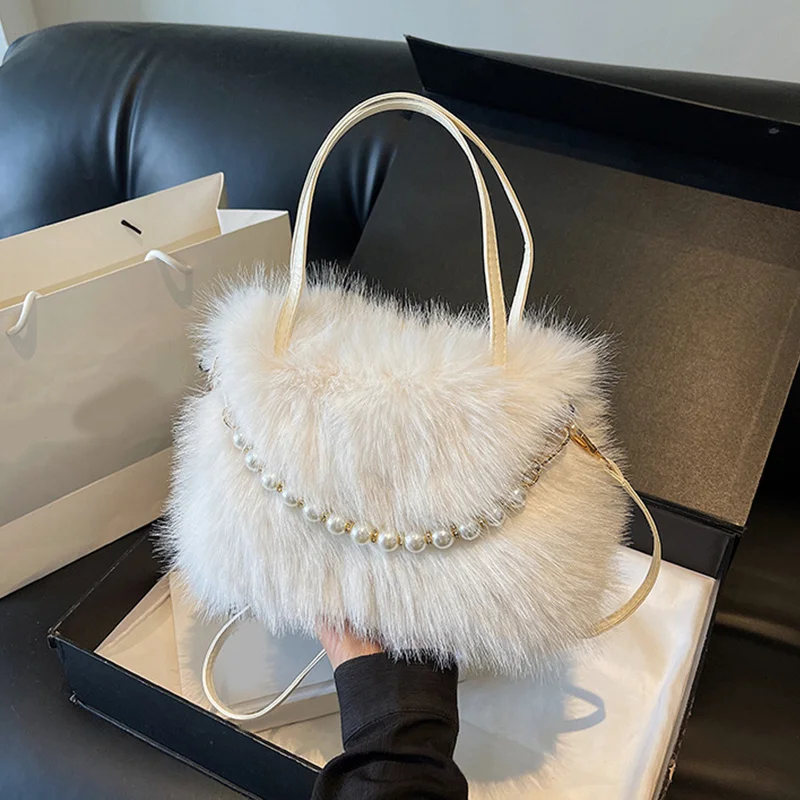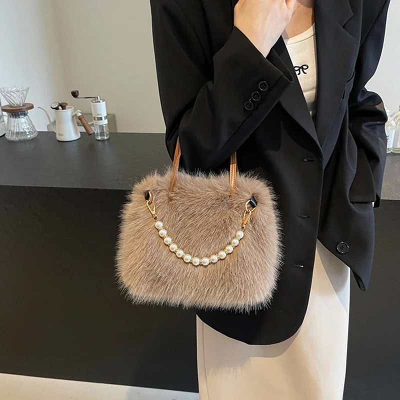 • Candy Color Pearl Handle Women's Plush Crossbody Bag Portable Female Furry Handbags Winter Fashion Casual Shoulder Bags